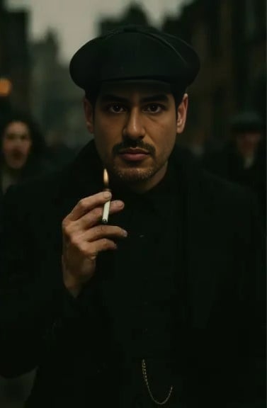 Transform the uploaded image (keep face details properly) into a Cinematic fronthead shot of me standing holding cigarette giving Badass Looks or action, Wearing A black outfit from Peaky Blinders series, People behind me running and scared, background with moody lighting 35mm film look Shallow depth of field. sharp focus on me and show the people a little bit. Portrait ratio 4:3.