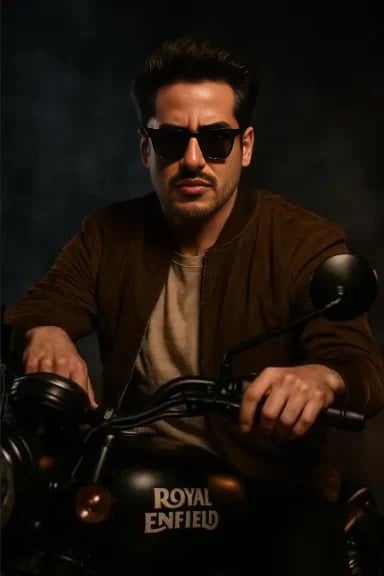 Make the reference photo with styled hair, wearing sunglasses and a brown bomber jacket over a beige t-shirt, sitting on a black Royal Enfield motorcycle. The background is dark and moody with dramatic lighting and smoke, giving a cinematic and intense atmosphere. The man looks directly at the camera with a serious expression. The lighting highlights the textures of the jacket and motorcycle. Shot with a shallow depth of field, giving 4k picture.