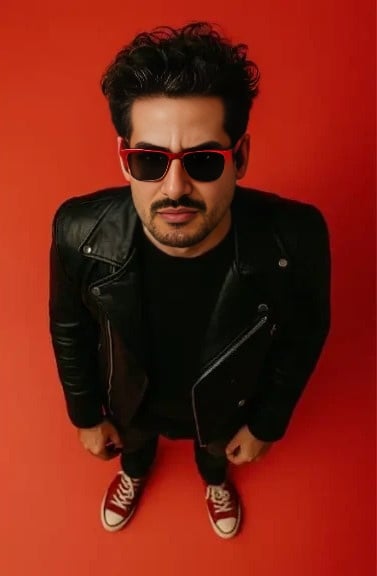 A young man standing against a solid red background, viewed from a top down angle. He is wearing a black leather jacket over a black shirt and dark pants, messy curly hair. He wears red sunglasses and red and white sneakers. The overall aesthetic is bold and fashion forward with a modern streetwear vibe.